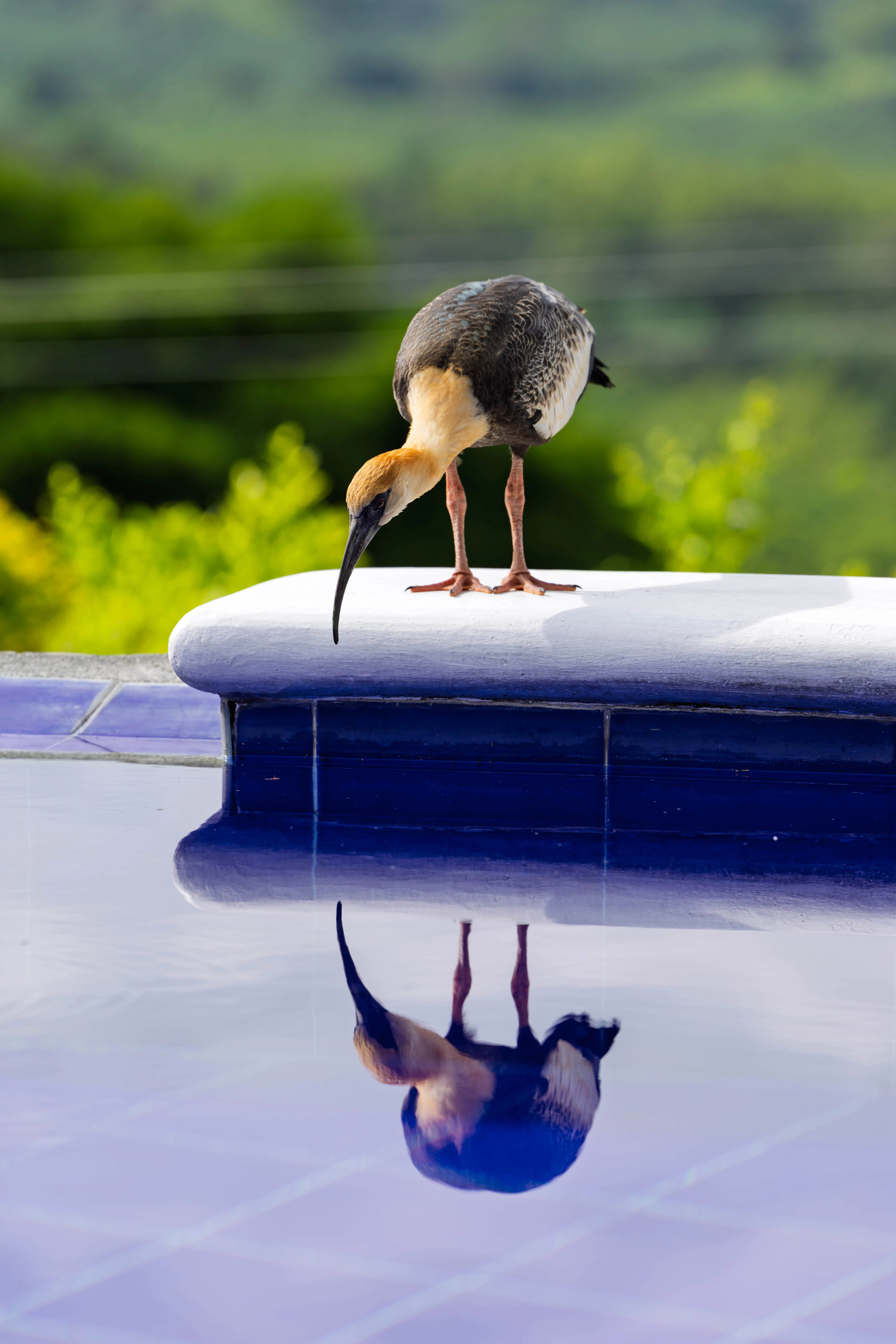 A bird visited the pool today and stuck around for a long time. I almost didn't notice I could catch its reflection in the pool.