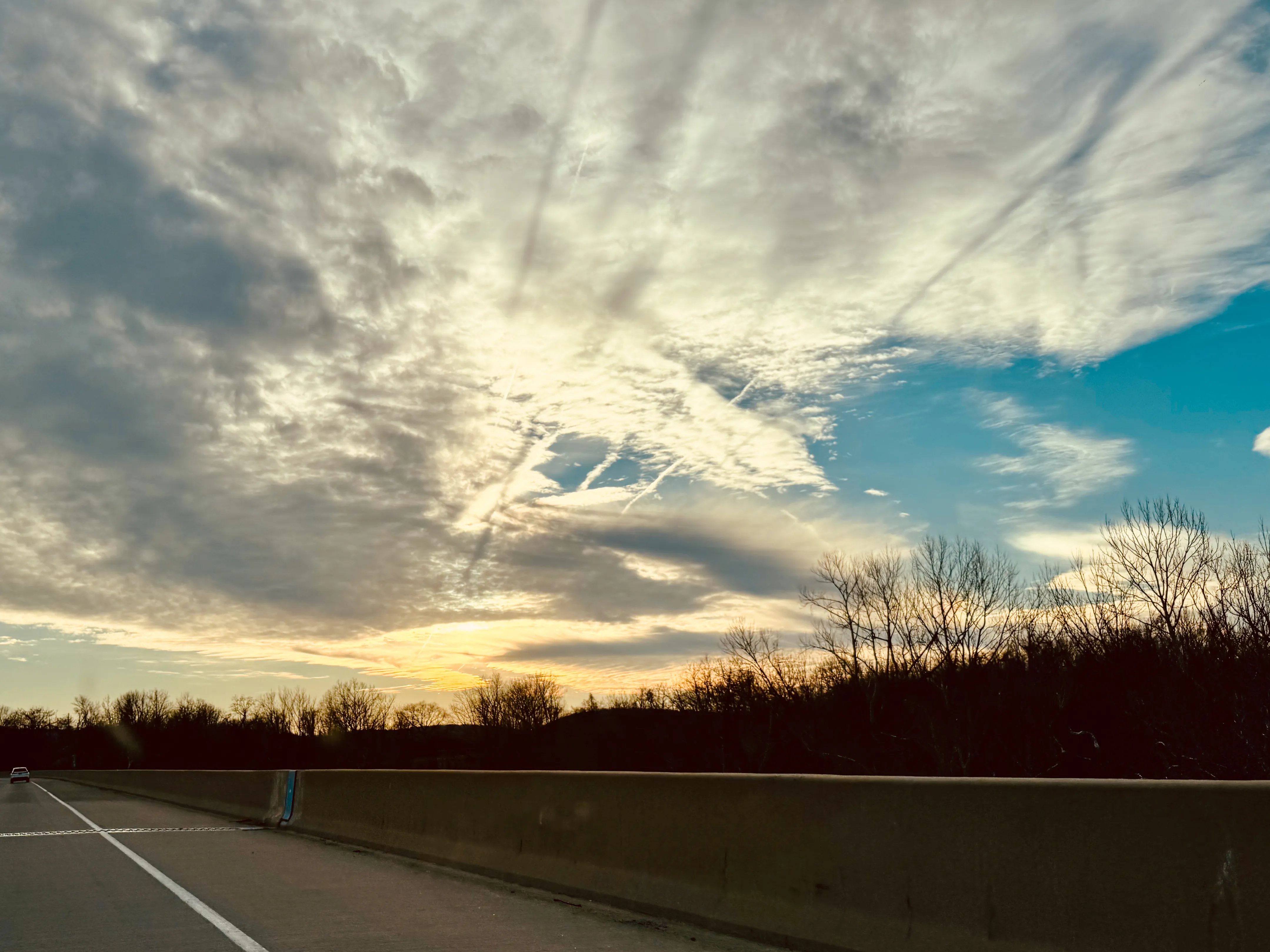 The sunset on the way to the train station today was pretty nice. We were driving, which delivered the two bonuses of framing being difficult and the windshield being dirty.