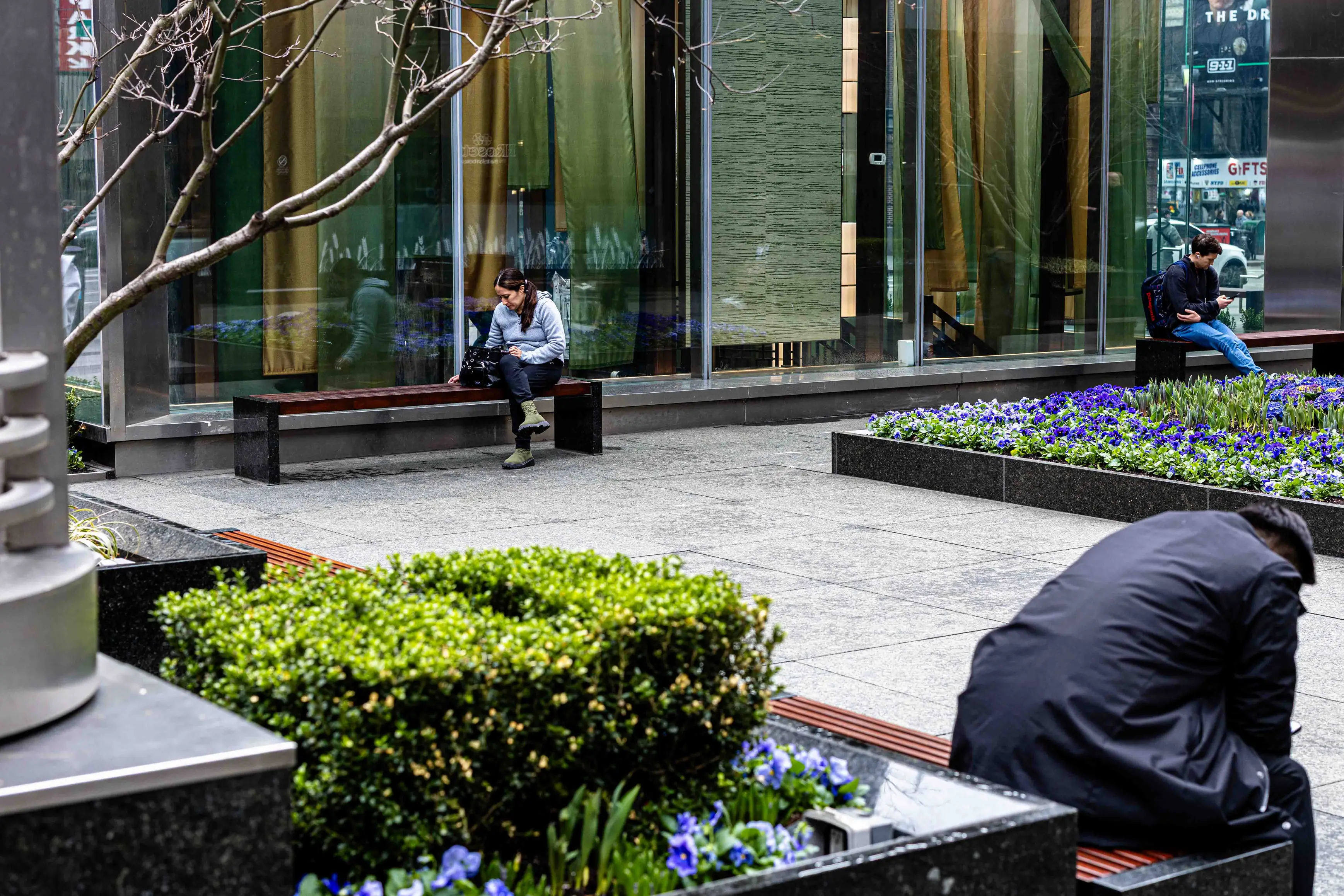 I like this shot. I had to wait a few times for walkers to get out of frame, which gave me a chance to adjust the framing. Getting the light pole on the left into the frame was good. The metallic bar in the top right is distracting, and I wish I had noticed it and found a way to avoid it. I should have focused on the woman in the back, but instead, I focused on the guy hunched over as he seemed most interesting to me.